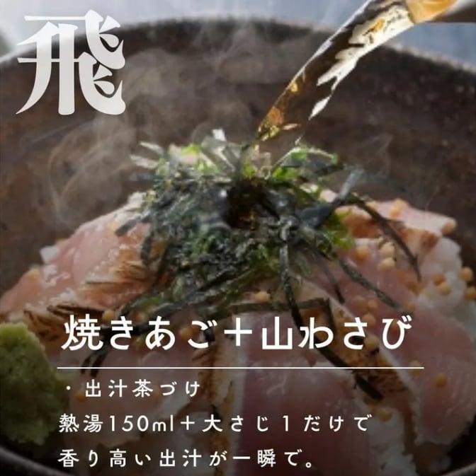 <焼アゴ醤油+わさび>飛魚(あご)の香ばしさに、ピリッとしたわさびのアクセントがクセになる珍しい組み合わせ。(おすすめ:卵かけご飯、お湯割りの出汁)