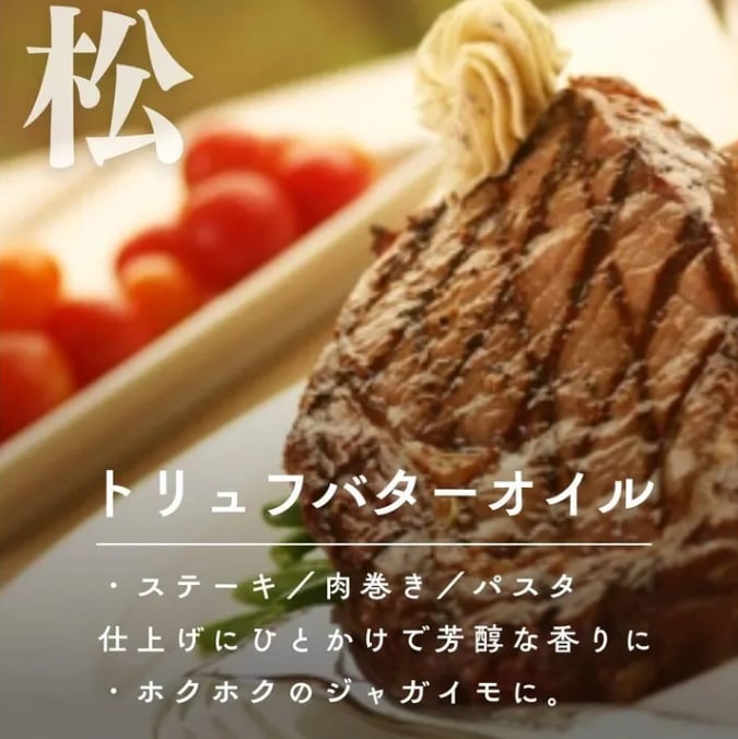 <トリュフバターオイル醤油>白トリュフの華やかな香りとバターのコクが食欲をそそる香り特化型。(おすすめ:ステーキ、ローストビーフ、リゾット)
